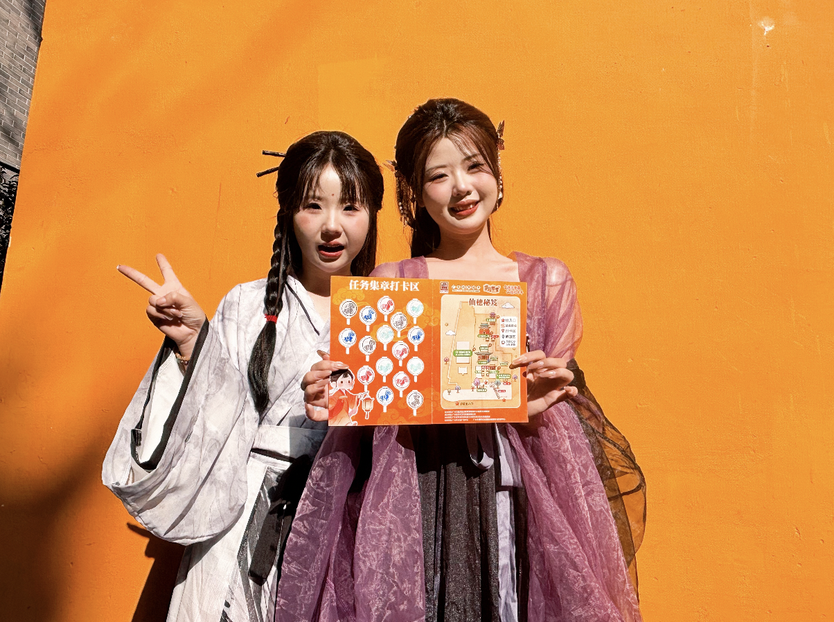 市集精心策划“仙穗使者”互动叙事体验,邀请游客漫步五仙观触摸广州“羊城”“穗城”由来的历史印记。游客入园时领取一本《仙穗秘笈》,循着秘笈指引,游客纷纷探访后殿——广州现存最完整的明代建筑,脊檩上“大明嘉靖十六年”的字迹,诉说着古迹的风雨沧桑。行至东侧,可见“仙人拇迹”,传说是仙人飞升时留下的脚印,经专家考证为晋代珠江洪水期流水冲蚀的遗迹,也是旧羊城八景“穗石洞天”的核心所在。游客循着任务线索穿梭于各个体验区之间,每完成一项体验或互动,即可加盖一枚纪念印章,集印便可兑换市集“穗币”,凭“穗币”可在市集享受消费优惠。这一趣味玩法将单向参观转化为主动探索,让文化传播从“我说你听”变为“我寻我得”。