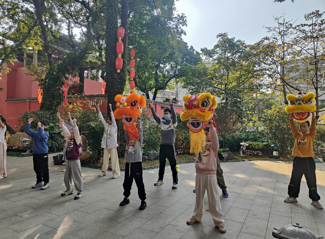 非遗手工课堂是本次市集的一大亮点,传统技艺融入当代节庆,成为非遗活态传承的生动实践。马勺脸谱——这一源自陕西民间的古老艺术形式,在当代设计师的巧思下被赋予了全新的生命力:传统图腾以高饱和度的荧光撞色重新演绎,让原本古朴粗犷的社火面具瞬间吸引了市民游客的目光;铜拓技艺传承人现场演示铜拓成画工序,以铜为纸、以锤为笔,从熔铜、锻打到錾刻、着色,每一道繁复工序都在叮当作响中缓缓铺陈,让观众直观感受传统技艺的匠心与温度。此外,醒狮非遗传承人为观众带来精彩展演,铿锵的鼓点、灵动的狮舞,点燃了现场的节庆氛围,尽显广府新春的热闹与活力。外地游客陈先生激动地表示:“这样的活动太有意义了!我们不仅能近距离看到非遗展示,还能深入了解到作品背后的技艺与故事,让我们对广府文化有了更深的认识。”